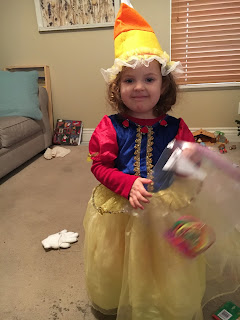 Opening her big present from mom and dad. She was thrilled by it. She pulled out all of the drawers discovering what was in each one. We had a few new dressups wrapped up for her in her gifts that she really enjoyed.